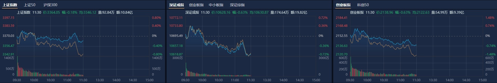 市场早盘震荡调整,三大指数小幅下跌。南财金融终端显示,截至早盘收盘,沪指跌0.18%,深成指跌0.63%股票配资8倍,创业板指跌0.63%。