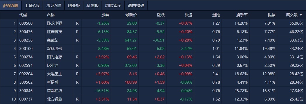 沪深两市半日成交额7848亿元,较上个交易日缩量883亿。个股方面,卧龙电驱成交额超55亿元居首,胜宏科技、寒武纪、双林股份成交额靠前。