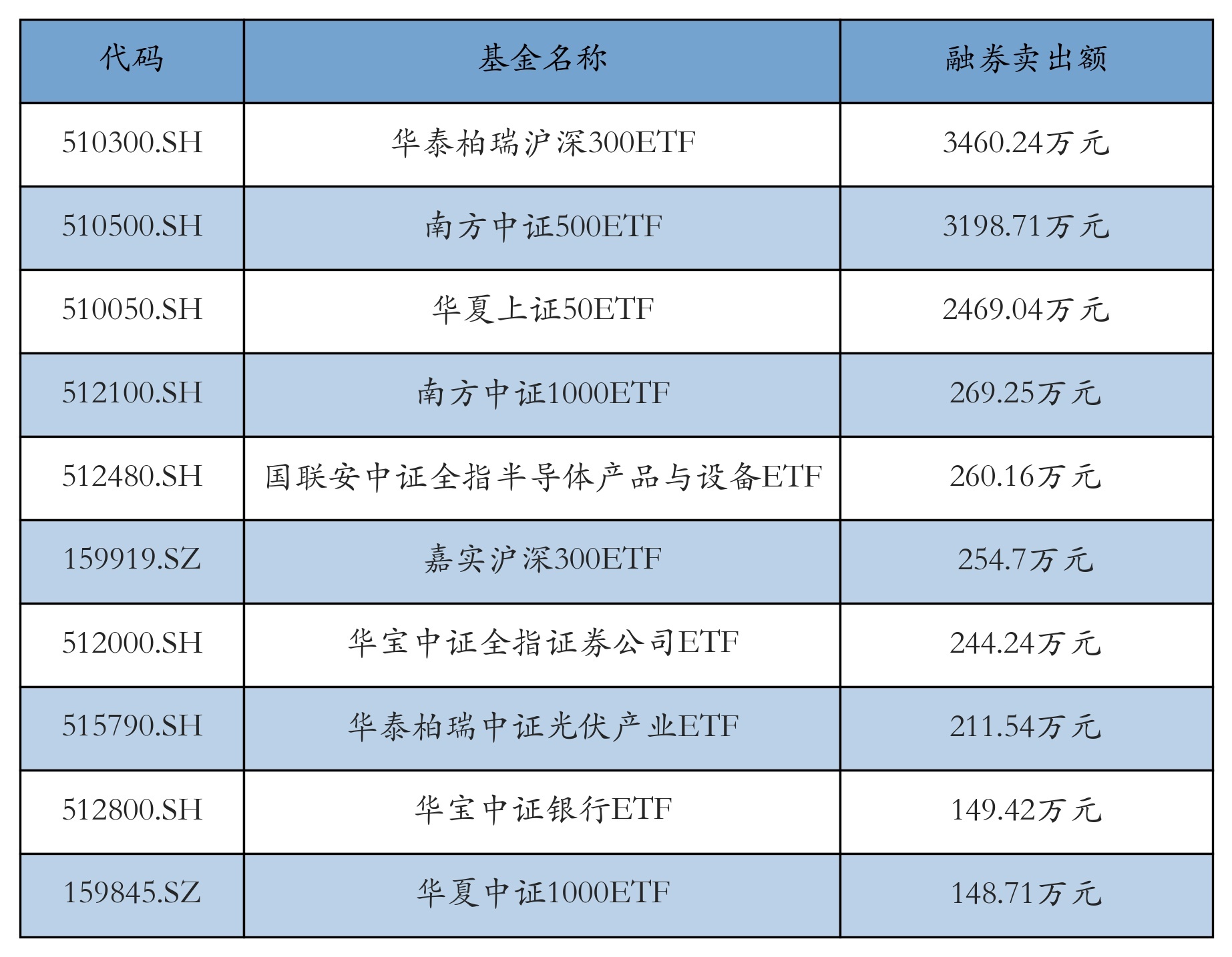 3月24日ETF融券卖出额前三位分别为:华泰柏瑞沪深300ETF(3460.24万元)、南方中证500ETF(3198.71万元)和华夏上证50ETF(2469.04万元),前10具体见下表: