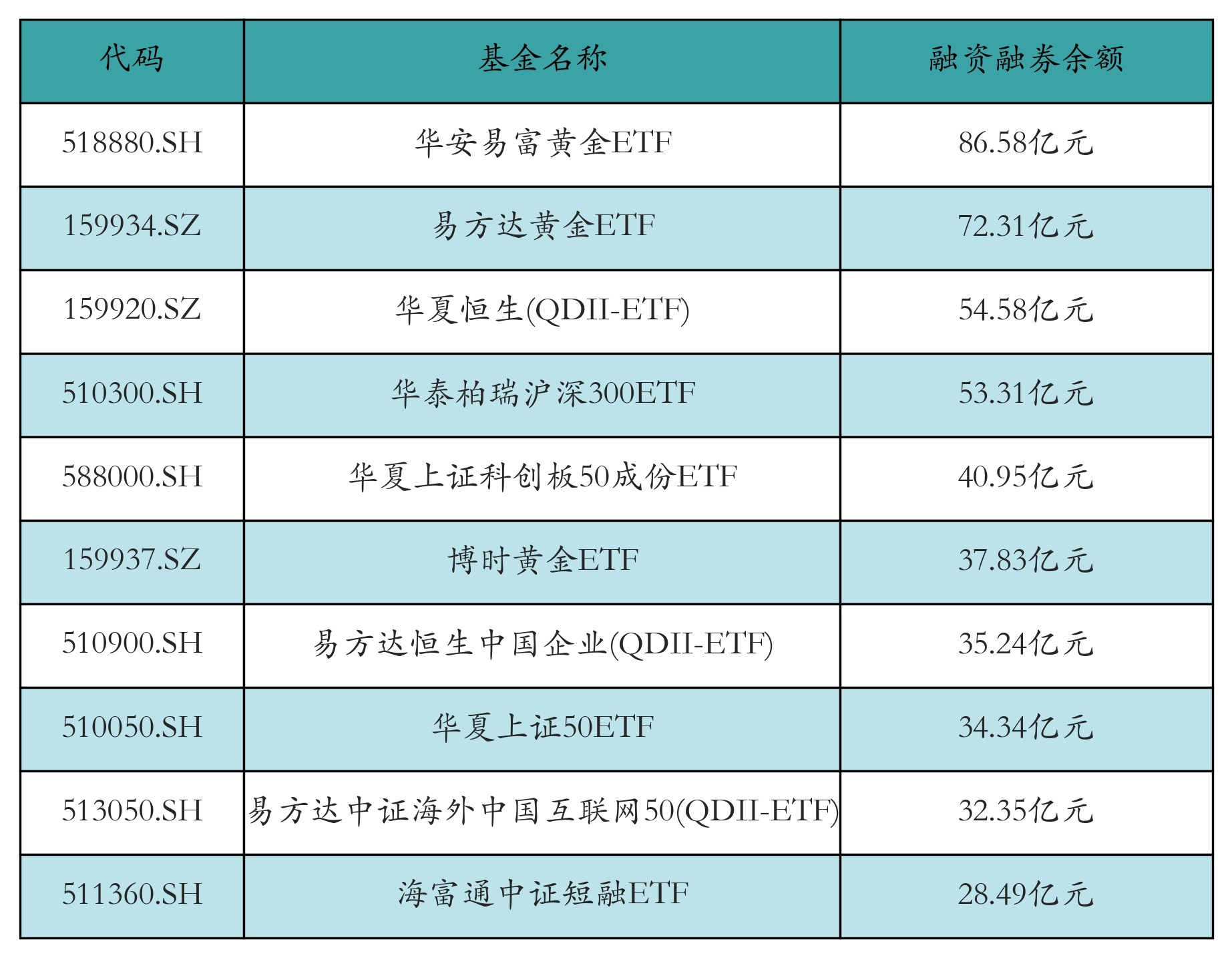 3月24日ETF两融余额前三位分别为:华安易富黄金ETF(86.58亿元)、易方达黄金ETF(72.31亿元)和华夏恒生(QDII-ETF)(54.58亿元),前10具体见下表: