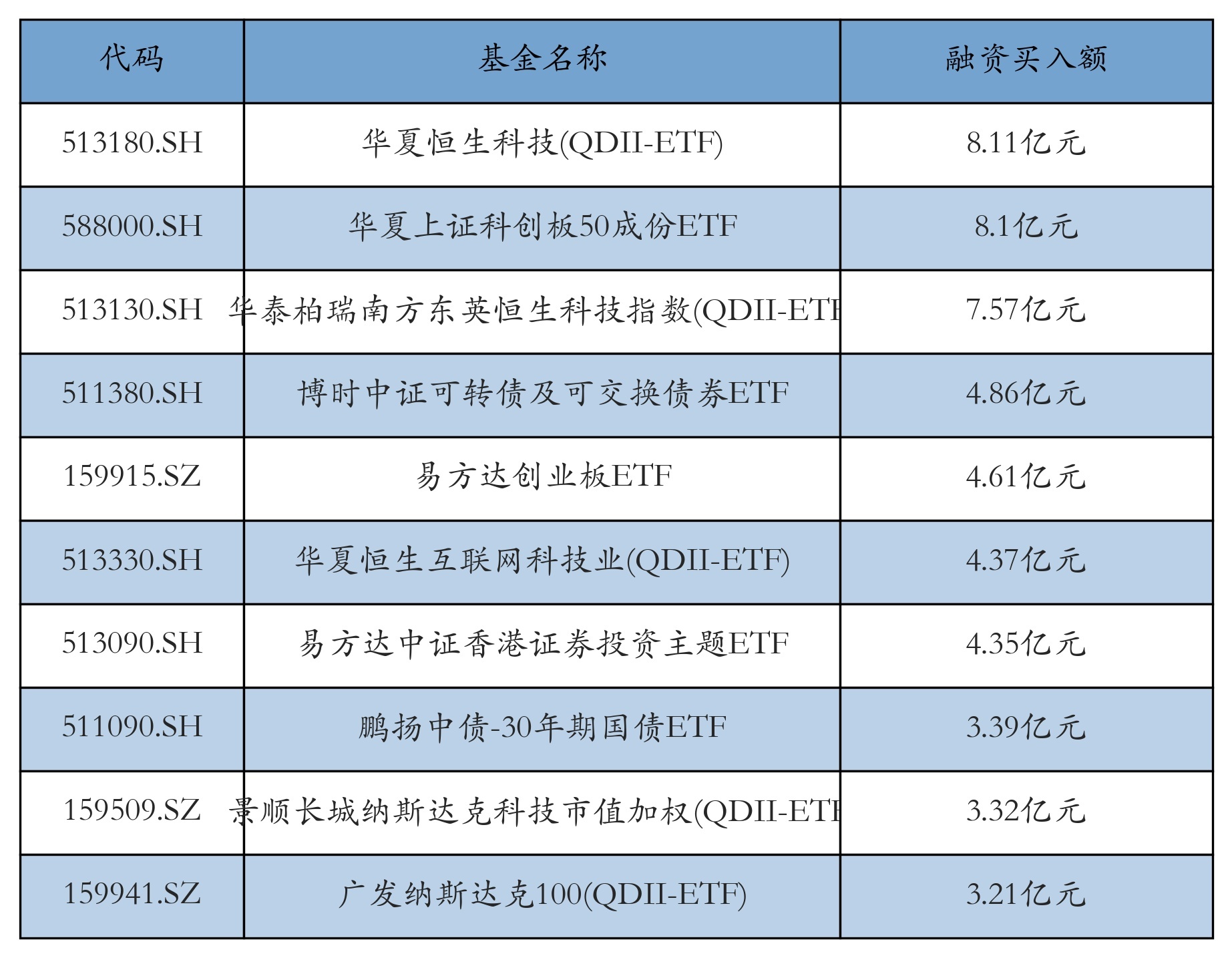 3月24日ETF融资买入额前三位分别为:华夏恒生科技(QDII-ETF)(8.11亿元)、华夏上证科创板50成份ETF(8.1亿元)和华泰柏瑞南方东英恒生科技指数(QDII-ETF)(7.57亿元),前10具体见下表: