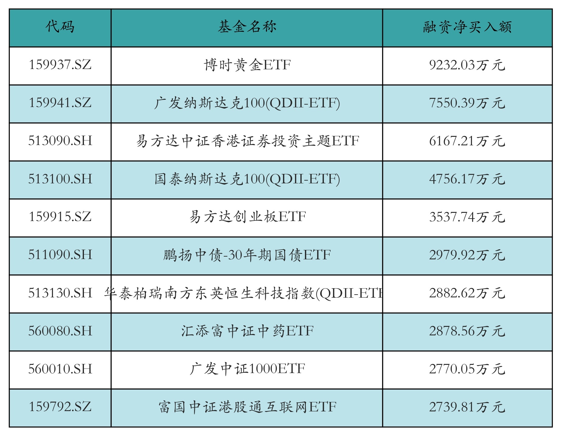 3月24日ETF融资净买入额前三位分别为:博时黄金ETF(9232.03万元)、广发纳斯达克100(QDII-ETF)(7550.39万元)和易方达中证香港证券投资主题ETF(6167.21万元),前10具体见下表: